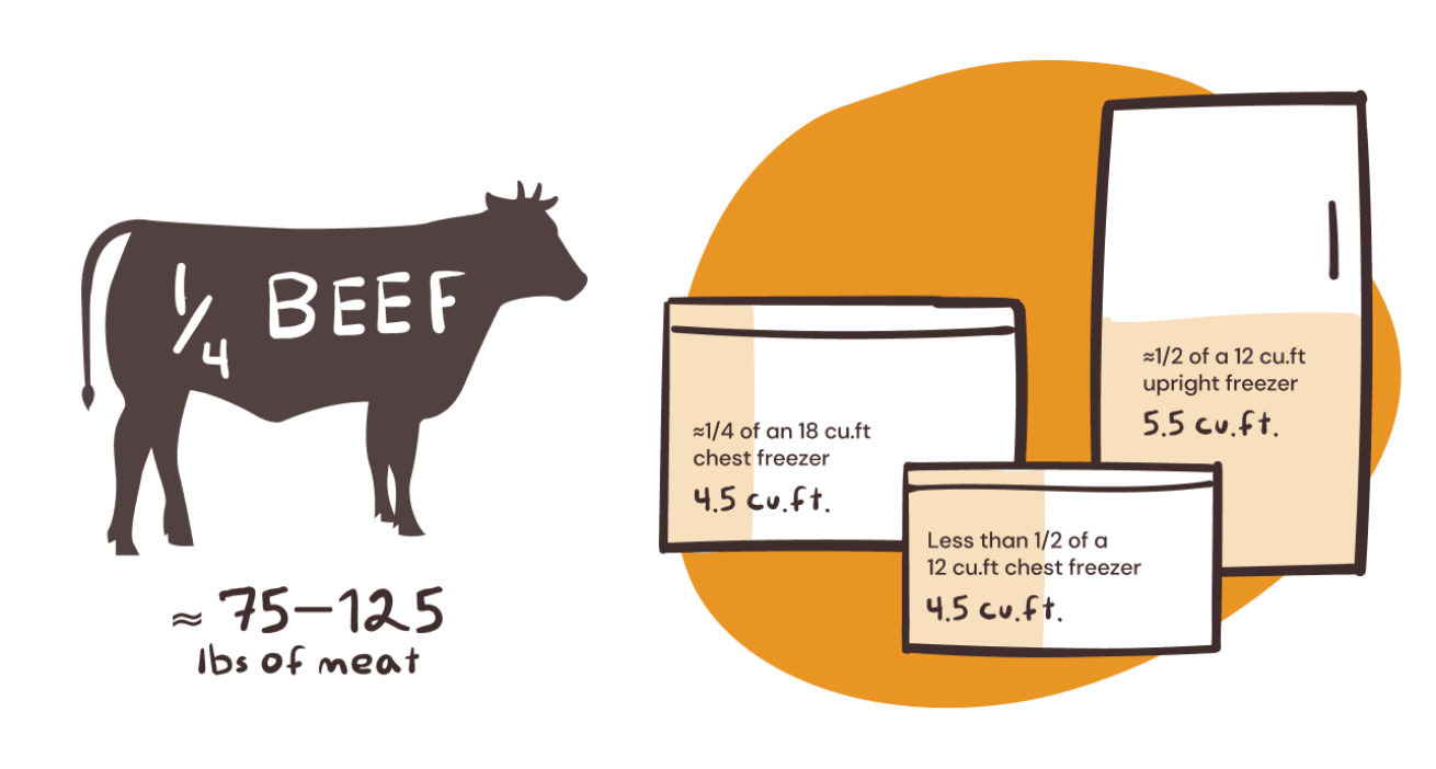 If you’re buying a quarter beef (around 75–100 pounds take-home packaged meat), a half hog (around 45–65 pounds of take-home packaged meat), and ten chickens, you would likely be in the market for a medium (12–18 cubic feet) freezer.